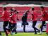 選手達に混じってアップするミシャ監督。
