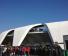 青い空に白いスタジアムの外壁。そして赤い東福岡のユニフォーム。